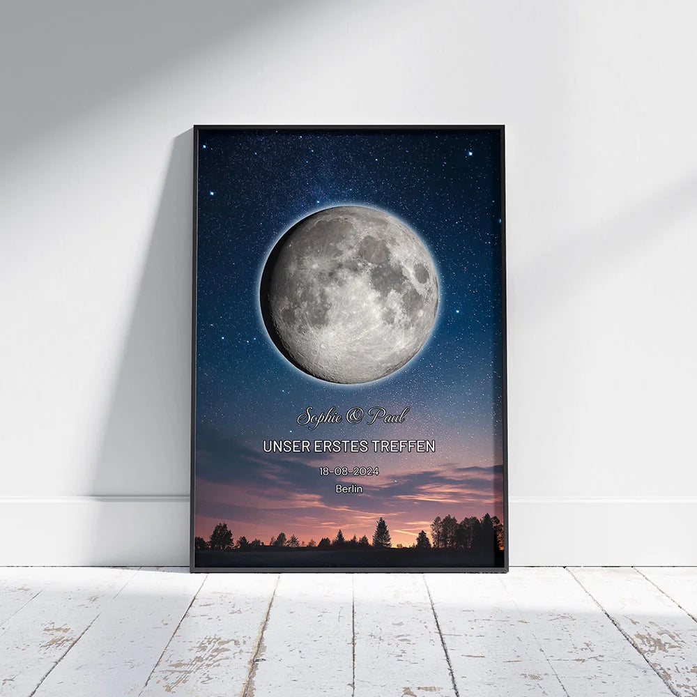 So entsteht ein individuelles Wandbild mit der Mondphase deines besonderen Datums, die emotionale Erinnerungen stilvoll festhält. Ideal als Geschenk zur Hochzeit, zum Jahrestag oder als persönliche Dekoration für dein Zuhause.